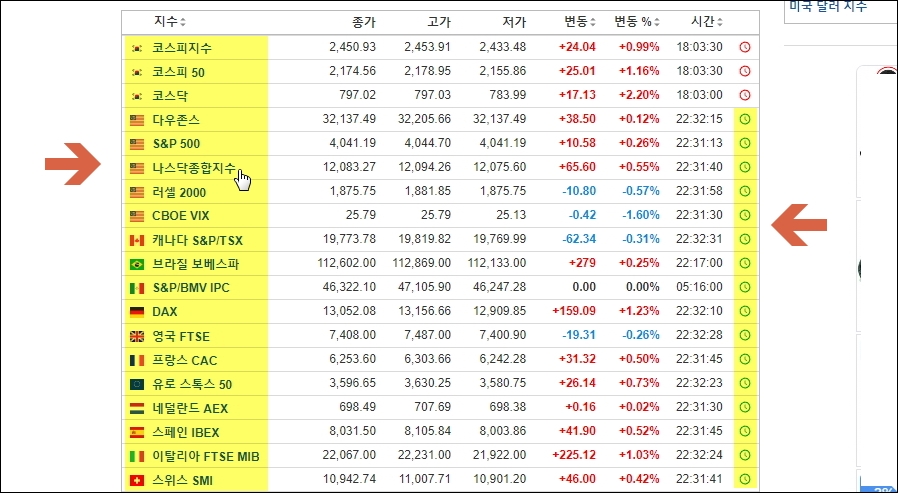 ▼새롭게 열린 페이지에서는 세계에서 경제적으로 큰 영향을 미치는 나라들의 지수가 나타납니다. 이를 통해 세계증시 상황을 쉽게 파악할 수 있죠. 표에서 맨 우측을 보면 시계 모양의 아이콘이 있는데요. 각 나라의 주식시장이 열린 상황에서 시계의 색이 녹색으로 됩니다. 이때 실시간으로 가격이 표에 반영되는 모습을 볼 수 있을 거에요. 현재 밤 10시 30분이기 때문에 국내 지수는 변동이 없지만, 다우존스부터 유럽의 여러 나라들까지 모두 실시간으로 시세가 변동하고 있습니다.