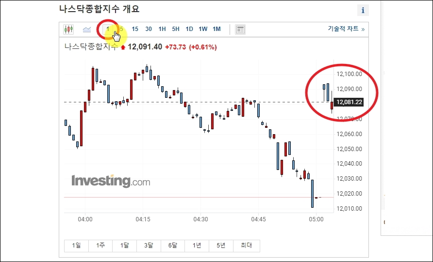 ▼가장 먼저 차트를 이용해 보았습니다. 그래프를 1분봉으로 변경해 보았는데요. 실시간으로 차트가 그려지는 모습을 제대로 볼 수 있습니다. 이러한 그래프에 따라서도 전 세계 주가가 영향을 다소 영향을 받는데요. 물론 이렇게 짧은 시간을 살펴보는 것은 크게 의미는 없습니다. 거짓 흐름이 많이 섞이기 때문입니다.