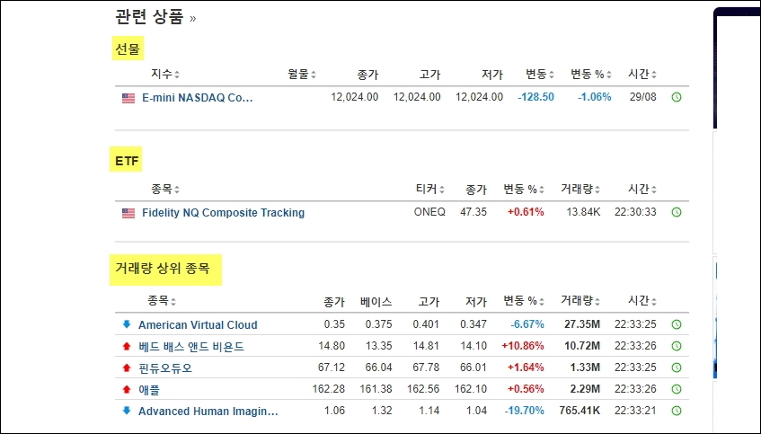 ▼나스닥 지수에 관련된 상품에 투자를 하고 싶을 수 있는데요. 해당 페이지에서 선물, ETF, 관련 종목에 대한 실시간 시세 정보를 확인할 수 있습니다. 앞으로 증시가 어떤 방향으로 흐를 것 같은지 확신이 들 때 이러한 상품을 이용하면 좋겠죠.