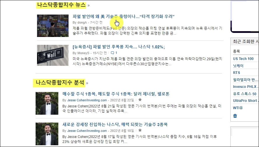▼최신 업데이트 되는 뉴스와 분석자료도 살펴볼 수 있는데요. 전 세계 경제의 중심은 미국이라고 할 수 있습니다. 나스닥은 미국의 대표적인 지수 중 하나고요. 그렇기 때문에 여기에 나오는 뉴스와 분석자료는 세계증시와도 관련이 깊다고 할 수 있습니다.