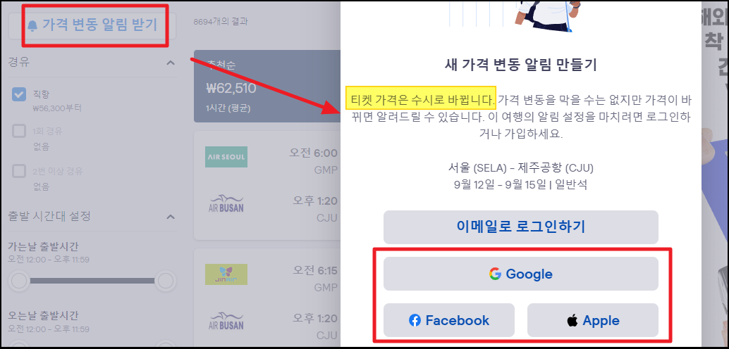 ▼금까지 제가 알려드린 방법을 따라 했음에도 불구하고, 찾은 항공권이 마음에 들지 않을 수 있습니다. 이러한 경우에는 [가격 변동 알림 받기] 버튼을 클릭해 보세요.