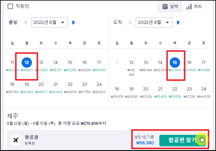 ▼저는 이번 달인 9월을 선택했습니다. 달력 형식으로 된 최저가 가격이 나타나는데요. 여기에서 살펴보니 가까운 날에 출발하는 제주도 항공권의 가격이 저렴하네요. 자신의 여행 일정을 감안하여 저렴한 날짜를 선택해 보세요. 날짜 선택 후에는 [항공편 찾기] 버튼을 클릭하면 됩니다.