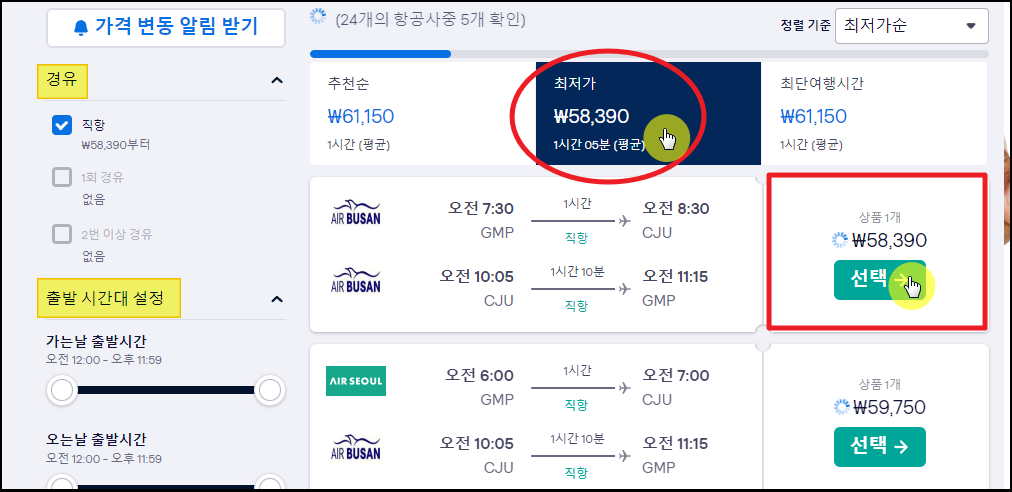 ▼새롭게 열린 페이지에서는 출발 시간대와 항공사를 선택하면 되는데요. 좌측에 있는 "출발 시간대 설정"을 이용하면 원하는 시간대에 탑승할 수 있는 왕복 항공권을 쉽게 찾아볼 수 있습니다. 이때 알고 계셔야 할 부분이 있는데요. 제주도 항공권을 찾는 사람들이 선호하는 시간대의 경우에는 티켓 가격이 높을 수 있습니다. 수요와 공급의 법칙에 따라 티켓 가격이 변하기 때문인데요. 반대로 사람들이 선호하지 않는 시간대를 선택하면 매우 저렴한 왕복 항공권을 찾을 수 있죠. 마음에 드는 항공편을 찾았다면 [선택] 버튼을 눌러주세요. 그럼 예약 진행을 할 수 있습니다.