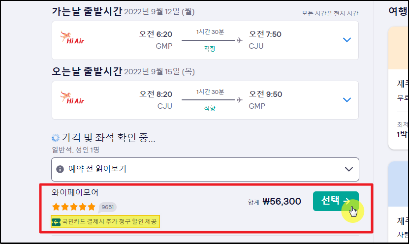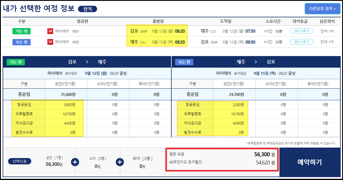 ▼금일 기준으로 9월에 싸게 판매되는 제주도 항공권을 찾아보았습니다. 왕복으로 56,300원이면 티켓 구매가 가능한데요. 티켓 가격을 결제할 때 KB카드를 이용하면 추가 할인을 받아 54,620원에 항공권 예약이 가능하네요. 여기서 말하는 티켓 가격은 항공운임, 유류할증료, 발권수수료, 제세공과금이 포함된 금액입니다.