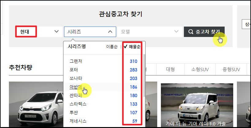 ▼ 관심 중고차 찾기 페이지가 열렸는데요. 여기에서 현대자동차를 선택한 후 시리즈 탭을 클릭해 주세요. 시세를 알아보고 싶은 중고차의 시리즈를 선택해 주세요. 아무래도 매물이 많을수록 적정 시세를 파악하는 데에 유리합니다. 현대자동차의 대부분의 모델이 보이는데요. 그랜저, 포터, 쏘나타, 아반떼 등이 있습니다. 원하는 시리즈와 모델을 선택한 후 [중고차 찾기] 버튼을 클릭해 주세요.