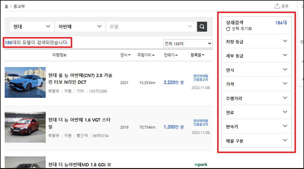 ▼ 저는 현대자동차의 인기 모델인 아반떼를 선택했습니다. 현재 186대의 중고차 매물을 찾을 수 있었는데요. 각 매물마다 연식, 차량등급, 주행거리가 제각각 이기 때문에 적정 시세를 파악하기에는 무리가 있습니다. 이 경우에는 우측에 있는 상세검색 기능을 활용하면 좋은데요. 본인이 선호하는 조건을 선택해 보세요.