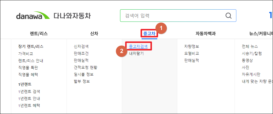 ▼ 다나와 자동차 홈페이지에 접속했습니다. 이곳에서는 중고차 외에도 신차, 렌트, 리스 차량에 대한 정보를 얻을 수 있는데요. 이번 시간에는 메뉴에 있는 [중고차 검색] 버튼을 눌러 현대자동차 중고 시세를 알아보도록 하겠습니다.