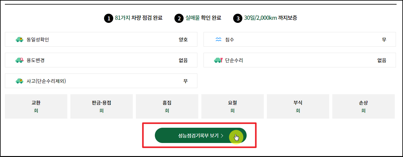 ▼ 마지막으로 현대자동차 중고차를 알아볼 때 성능점검기록부를 꼼꼼히 살펴보세요. 해당 매물에 대하여 점검한 내역을 자세하게 알아볼 수 있습니다.