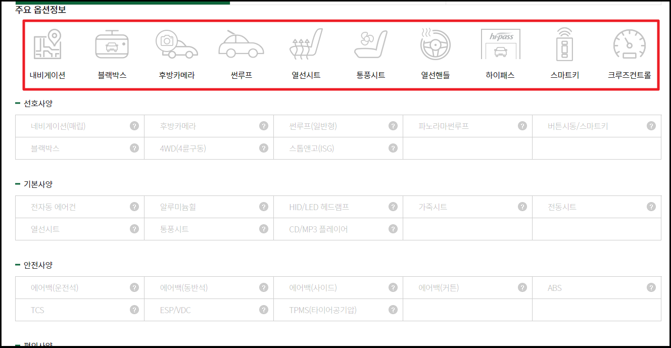 ▼ 신차와 다르게 중고차를 구입하는 경우에는 옵션을 마음대로 추가할 수 없습니다. 그렇기 때문에 어떤 옵션을 갖추고 있는지 살펴보는 것이 중요해요. 개인적으로 후방카메라 정도는 기본적으로 갖추어야 한다고 생각합니다. 블랙박스와 하이패스 단말기의 경우에는 직접 설치가 가능하기 때문에 크게 염두하지 않아요.
