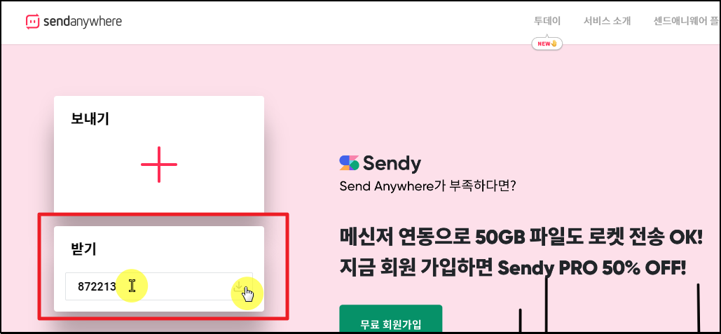 ▼ 사이트에 접속하면 보내기와 받기 영역이 있습니다. 여기에서 받기 영역에 있는 빈 칸에 6자리 숫자 코드를 입력합니다. 좀 전에 핸드폰에서 보내기 버튼을 눌렀을 때 나타난 숫자를 입력하면 됩니다. 숫자 코드를 모두 입력했으면 바로 우측에 있는 다운로드 버튼을 클릭해 주세요.