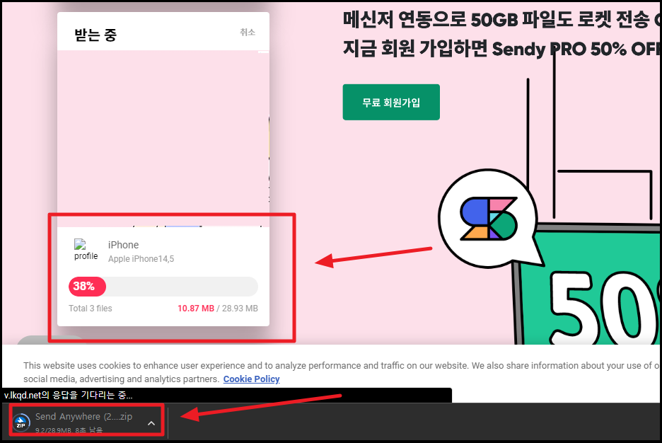 ▼ 핸드폰에서 컴퓨터로 사진 옮기는 작업이 진행되는데요. 요즘 인터넷 기술이 발전하여 굉장히 빠른 속도로 전송이 됩니다. 100%가 되면 인터넷 브라우저 창에 다운로드 완료 버튼이 나타납니다. 해당 버튼을 클릭해 주세요.