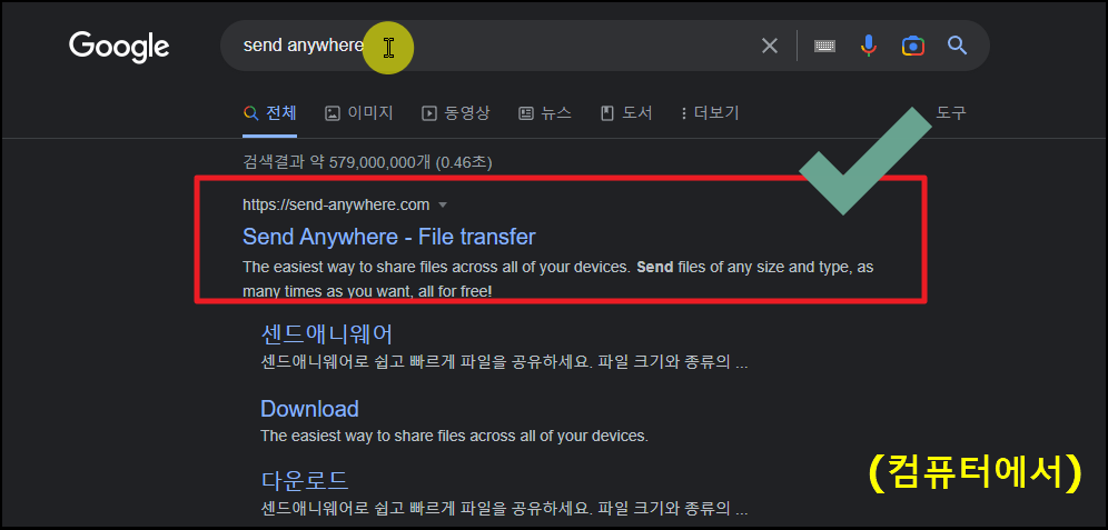 ▼ 이번에는 컴퓨터로 핸드폰 사진을 다운 받을 준비를 해야 합니다. 컴퓨터에서는 센드애니웨어 프로그램을 설치할 필요가 없습니다. 프로그램 설치 없이 컴퓨터로 사진 옮기는 방법을 알려드릴게요. 일단 send anywhere 공식 홈페이지에 접속해주세요. 한글화가 잘 되어 있기 때문에 영어를 몰라도 핸드폰 사진 옮기는 작업을 수월하게 진행할 수 있습니다.