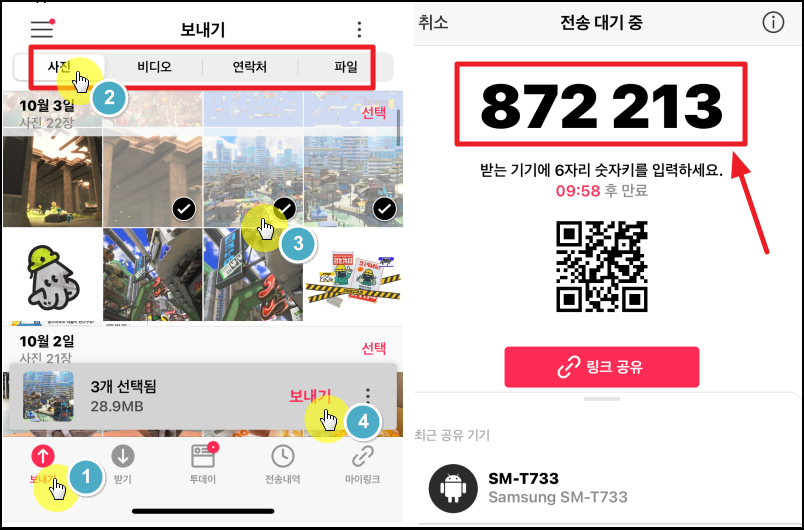 ▼ 다운 받은 센드애니웨어 앱을 이용하여 핸드폰 사진을 컴퓨터로 옮겨 보도록 하겠습니다. 앱을 처음 실행한 후 화면 하단 좌측에 있는 [보내기] 버튼을 클릭해 주세요. 그럼 내 핸드폰에 들어있는 사진, 비디오, 연락처, 파일을 선택할 수 있습니다. 여기에서 컴퓨터로 옮기는 작업을 진행할 대상인 핸드폰 사진을 선택하면 됩니다. 모두 선택하면 앱 화면 하단에 나타나는 [보내기] 버튼을 클릭하면 됩니다. 그럼 6자리 숫자코드와 QR코드가 생성 됩니다. 여기에 있는 코드를 기억해 두세요.