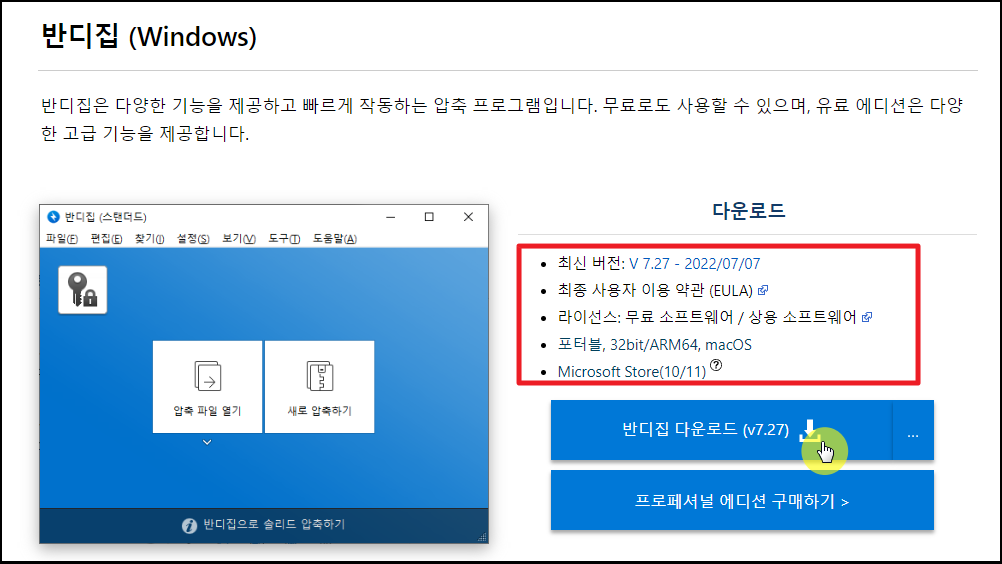 ▼ 반디집 사이트에 접속하면 압축 프로그램을 무료로 다운로드 받을 수 있는데요. 안내 문구에 보면 무료 소프트웨어 표시를 확인할 수 있습니다.