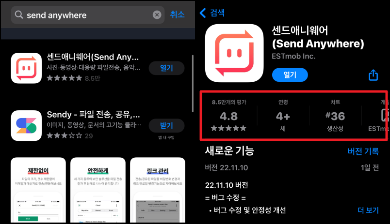 ▼ 해당 방법은 아이폰은 물론이고, 안드로이드폰에서도 사용이 가능합니다. 일단 스마트폰에서 어플을 하나 다운 받아 설치해야 하는데요. 안드로이드폰의 경우에는 구글 플레이스토어에서 센드애니웨어 앱을 다운 받으면 되는데요. 아이폰은 앱스토어에서 "send anywhere"를 검색하면 됩니다. 무료로 사용할 수 있으니 부담이 전혀 없어요.
