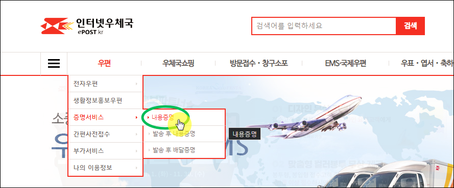 ▼ 우체국 공식 홈페이지에 접속했습니다. 메뉴에서 [우편], [증명 서비스], [내용증명]을 순차적으로 클릭해 주세요.