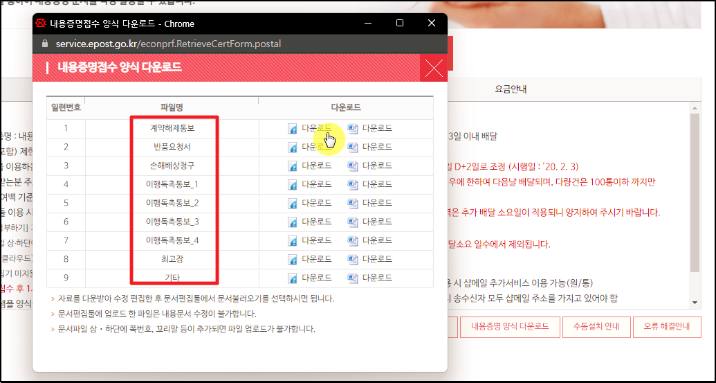 우체국 내용증명 양식 다양하게 다운 받기.