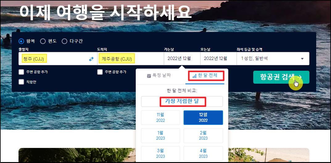 날짜를 입력할 때는 월 단위로 선택하는 것이 좋은데요. 이렇게 하면 싸게 항공권 예약을 진행하는데 도움이 됩니다.