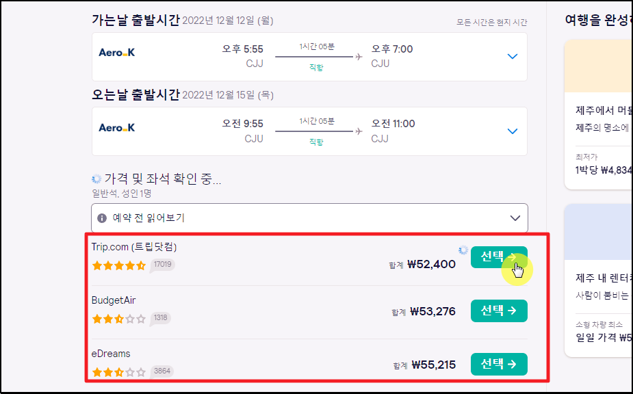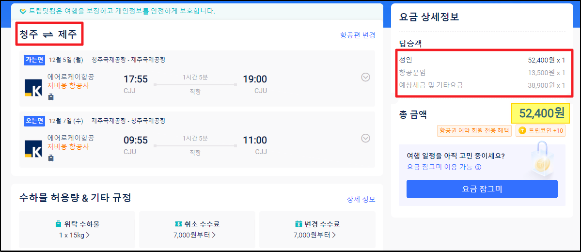 ▲ 위와 같이 요즘에는 청주 제주 왕복 항공권의 요금이 52,400원 정도 밖에 되지 않습니다.