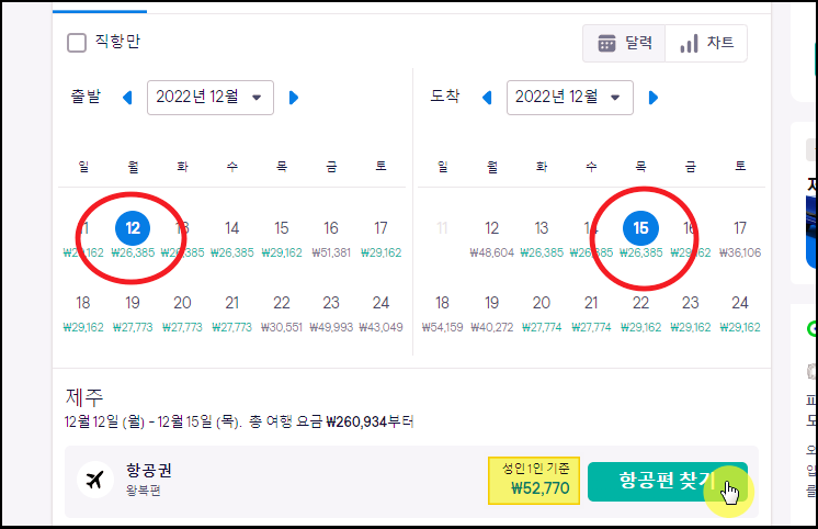 여기에 표시된 가격은 예약할 수 있는 비행기표의 최저가격을 의미합니다. 아무래도 최저가가 낮은 날짜를 선택하는 것과 저렴하게 항공권 예약을 진행 것에는 큰 연관성이 있죠.