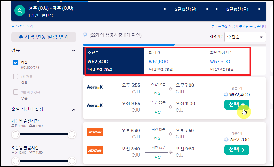 ▲ 날짜를 선택하면 다음과 같이 여러가지 청주 제주 노선의 항공편 리스트가 나타납니다. 여기에서 마음에 드는 항공사와 출발 시간 때를 참고하여 선택 버튼을 누르면 바로 항공권 예약을 진행할 수 있습니다.
