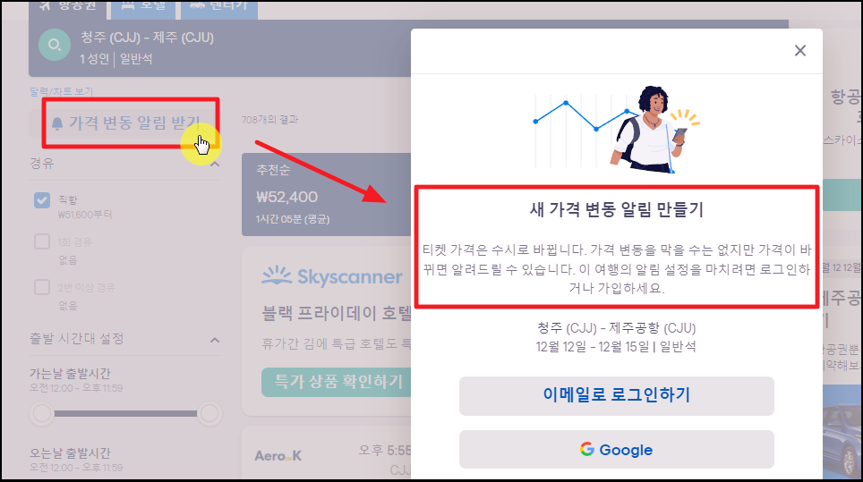 ▲ 스카이스캐너 사이트를 이용한 청주 제주 항공권을 찾는 방법을 따라 했음에도 원하는 금액대에 티켓을 구하지 못했다면 [가격 변동 알림 받기] 기능을 이용해 보세요.