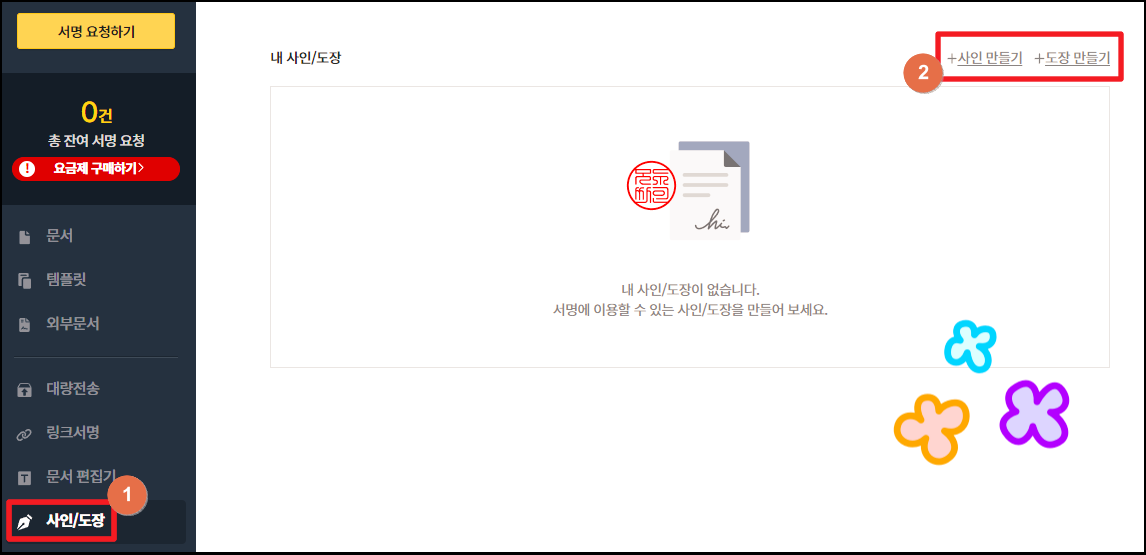 맨 우측 상단에 보면 "사인 만들기"와 "도장 만들기" 버튼이 있습니다. 도장 먼저 선택해주세요.