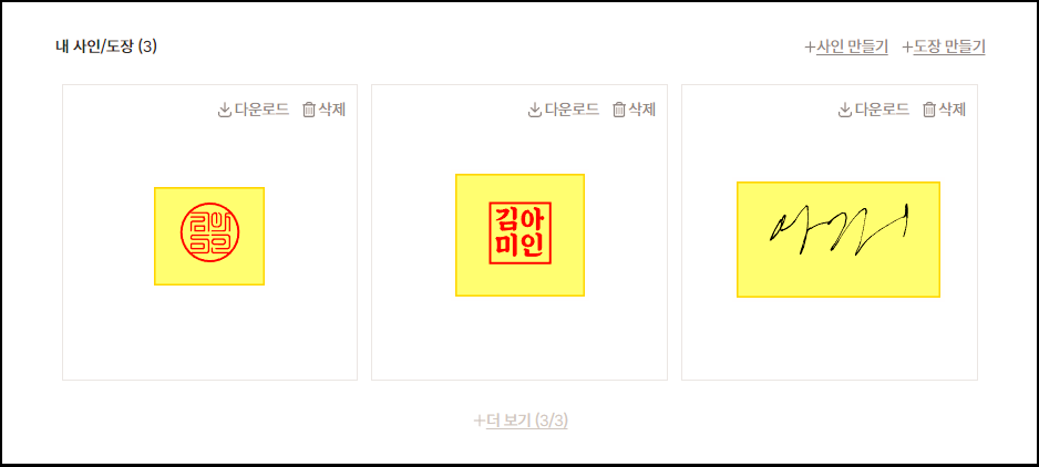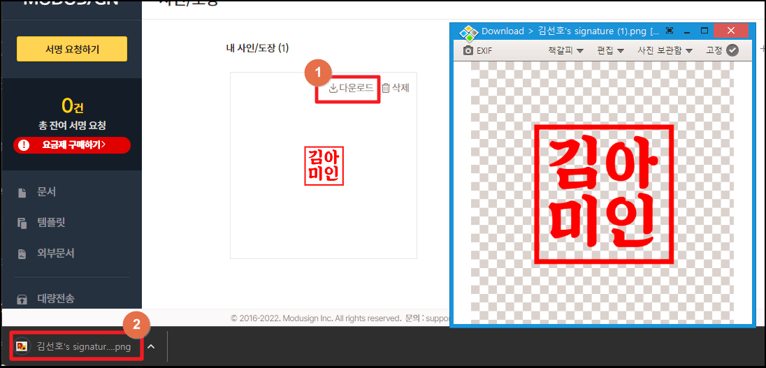▲ 다시 관리 페이지로 이동하게 되면서 내 전자서명 목록에는 방금 만든 도장이 추가 되어 있는 것을 확인할 수 있는데요. 여기에서 "다운로드" 버튼을 누르면 png 파일로 이미지를 내려 받게 됩니다.
