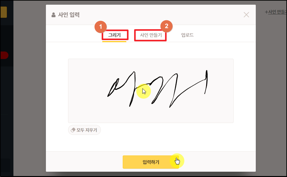 ▲ 이번에는 싸인 만들기를 진행해 보겠습니다. 싸인의 경우에는 직접 그리는 방식과 내용을 입력하여 사인을 만드는 방식이 있는데요. 진짜 마우스로 그려 보았습니다.
