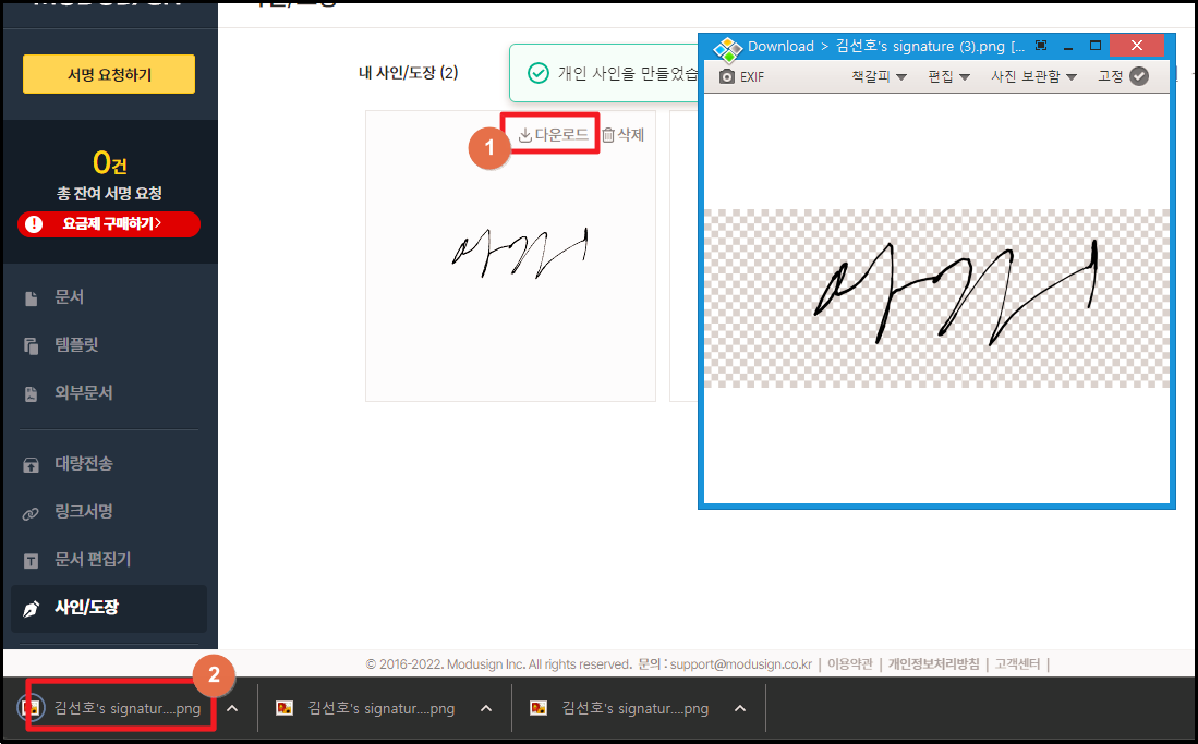▲ 방금 만든 것도 이미지 파일로 다운로드 받아 보았습니다. 배경이 투명으로 되어 있네요. 이런 식으로 전자서명을 제작하면 됩니다.