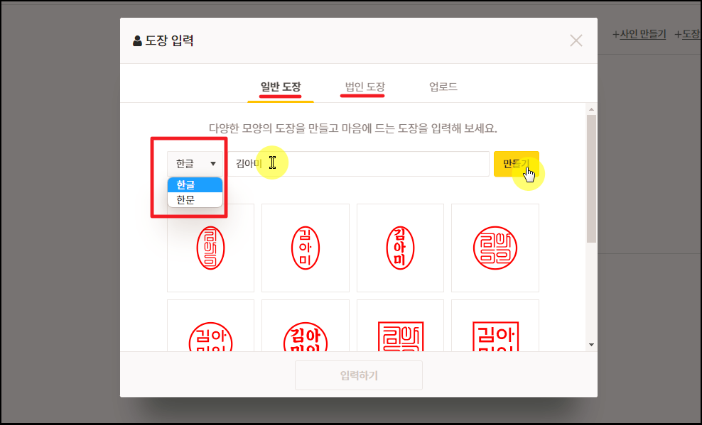간단하게 도장에 입력하고 싶은 내용을 빈 칸에 넣어 주세요. 그 다음 [만들기] 버튼을 누르면 됩니다. 한글은 물론이고, 한문으로 된 도장도 만드는 것이 가능합니다.