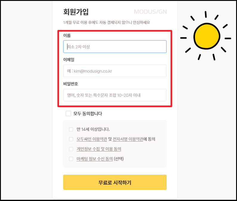 이름, 이메일, 비밀번호 정도만 입력하면 되기 때문에 정말 편하게 사이트 가입이 가능해요. 참고로 이곳에서 이용하는 전자서명 제작 서비스는 제한 없이 무료로 사용이 가능합니다.
