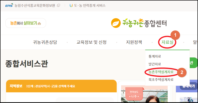 여기에서 농가주택 표준설계도를 찾는다면 메뉴에 있는 [자료실]과 [농촌주택설계자료]를 선택하면 됩니다.