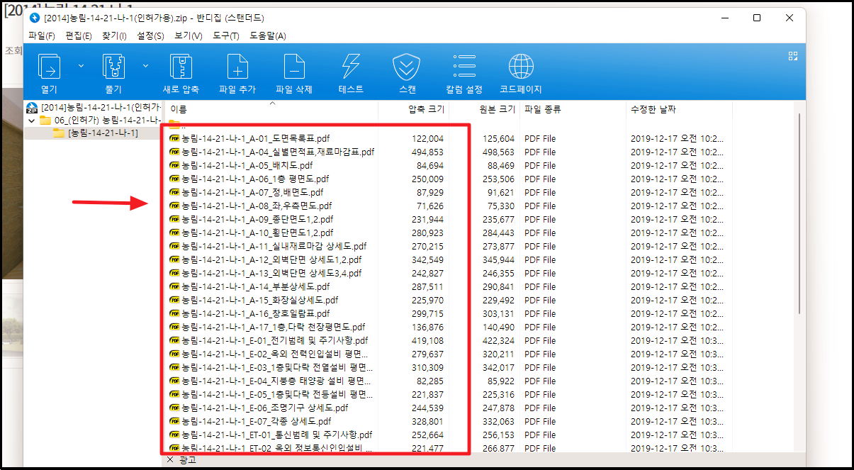 반디집이나 알집을 이용하면 됩니다. 두 가지 모두 무료로 다운 받아 사용할 수 있는 프로그램입니다. 저는 반디집으로 압축을 풀어보았는데요. 도면목록표, 배치도, 평면도, 단면도, 상세도 등 다양한 도면 파일을 얻을 수 있었습니다.