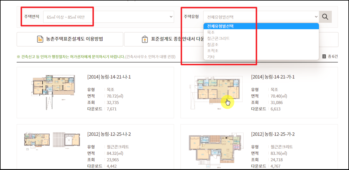 조건을 선택하면 화면에서 하단 부분에 표준설계도 리스트가 나타나는데요. 여기에서 도면 자료를 다운 받고 싶은 농가주택을 선택하면 됩니다.