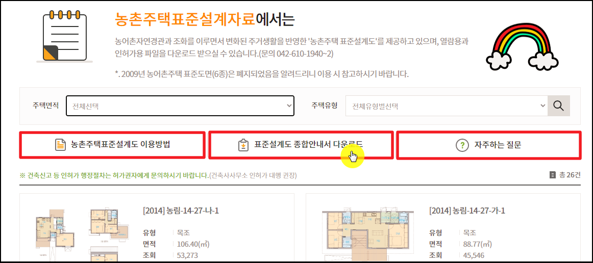 ▲ 새롭게 열린 페이지를 보면 농촌주택 표준설계도에 대한 이용방법, 종합안내서, 자주하는 질문 메뉴가 나타나는데요.