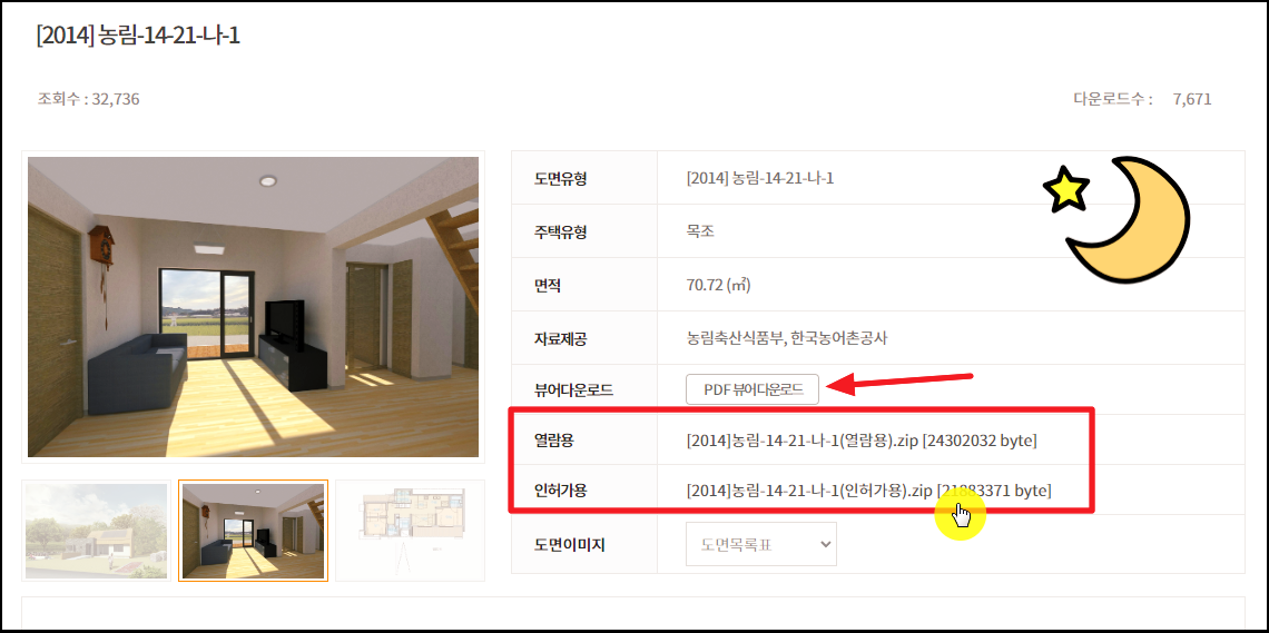 해당 페이지를 보면 표준설계도 자료가 2가지로 되어 있는 것을 확인할 수 있습니다. 열람용과 인허가용인데요. 농가주택을 지으려고 할 때에는 인허가용을 사용하면 됩니다.