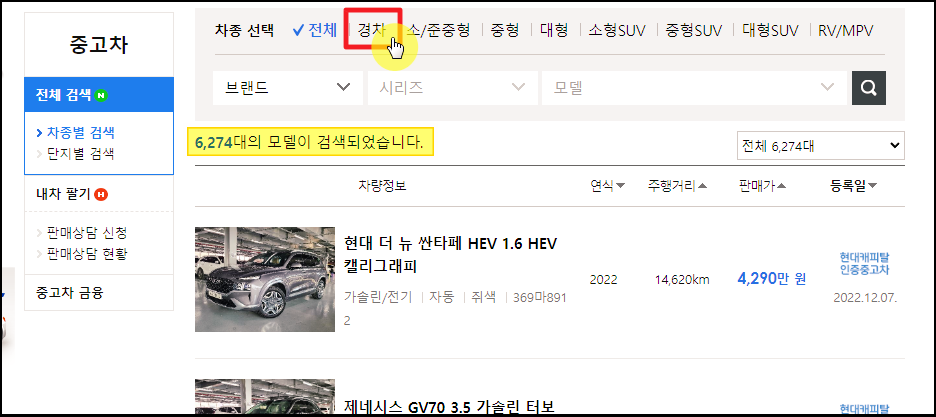 경차에 해당하는 중고차 종류만 묶어서 살펴보고 싶다면 좌측에 있는 [차종별 검색] 메뉴를 선택해야 합니다.