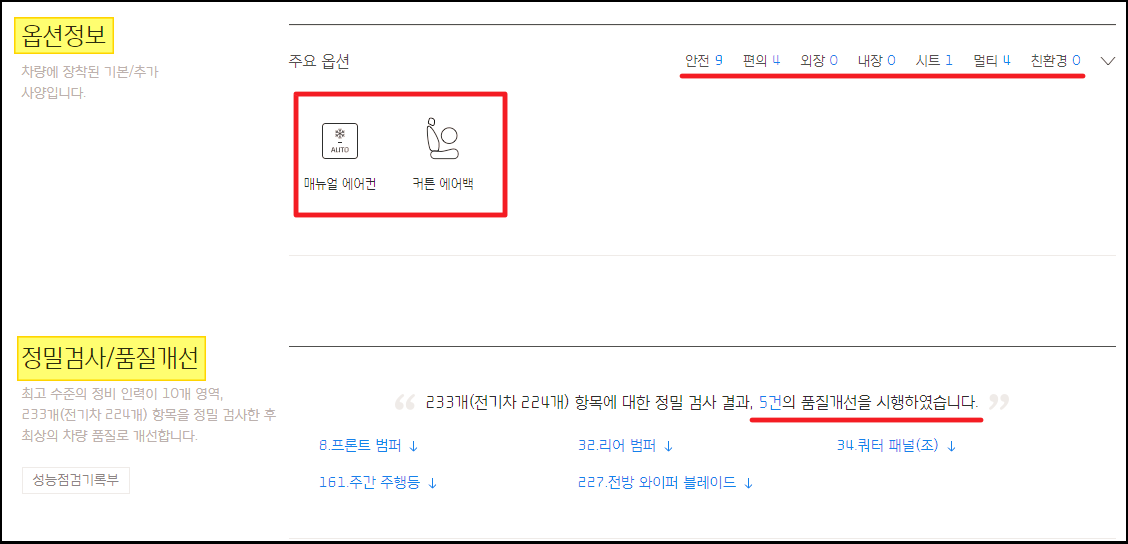 안전, 편의, 외장, 내장, 시트, 멀티, 친환경에 관련된 옵션의 갯수를 바로 확인할 수 있어요. 이 외에도 정밀 검사나 품질개선에 관련된 정보도 살펴볼 수 있고요.