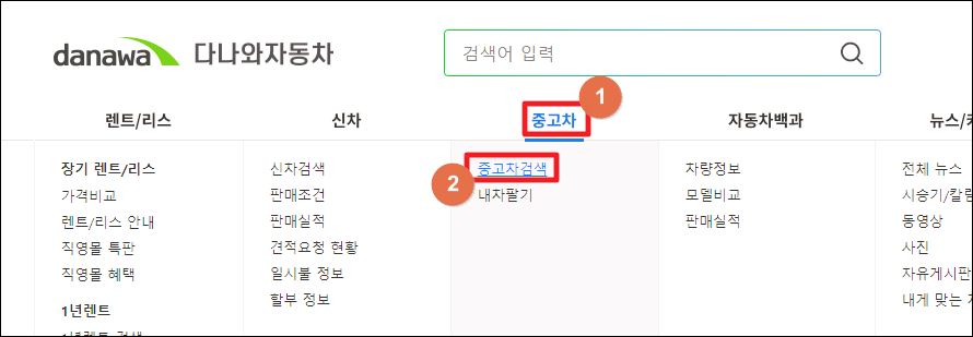 다나와 자동차에 접속하면 메뉴에 있는 [중고차 검색]을 선택해 주세요. 참고로 이곳에서는 중고차 외에 신차, 렌트카, 리스 차량에 관련된 가격 확인도 가능합니다.
