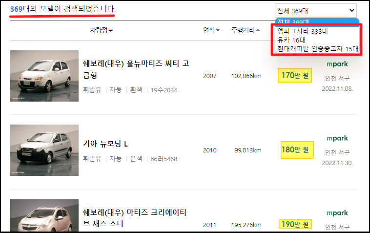 ▲ 현재 기준으로 369대의 경차에 해당하는 중고 자동차 매물을 찾아볼 수 있습니다. 가장 저렴하게 나온 매물의 가격 170만원이네요.