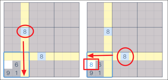 여기서 어려운 문제를 푸는요령을 발견할 수 있는데요. 위 상황을 보면 가로 줄과 세로 줄에 있는 8번이 포함되어 있습니다. 이런 상황이기 때문에 좌측 하단에 있는 큰 사각형에는 8번이 들어갈 자리가 1곳 밖에 없게 됩니다.
