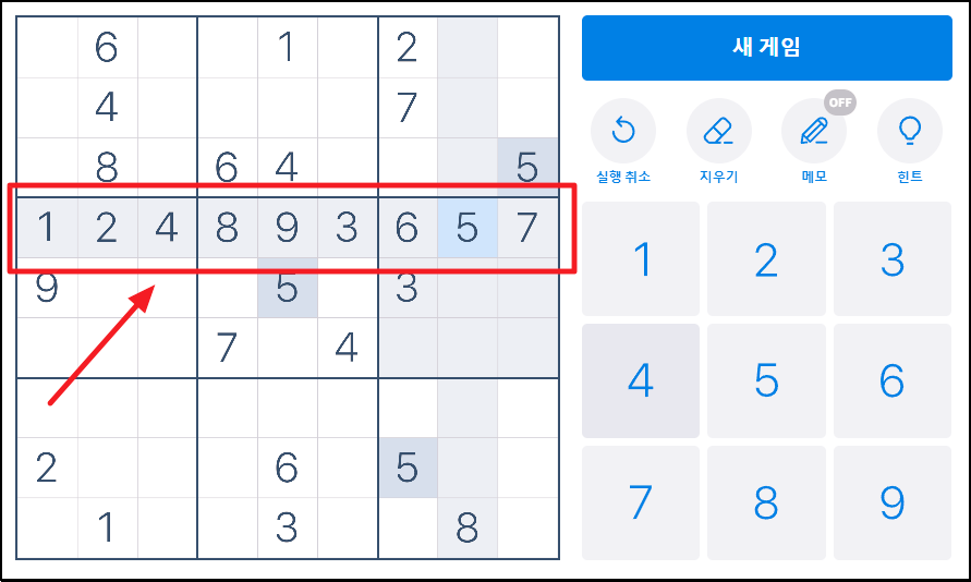 이번에는 4번째 행에 위치한 칸에 모든 숫자를 입력해 보았습니다. 이렇게 서로 중복되지 않는 숫자를 입력하면 돼요.