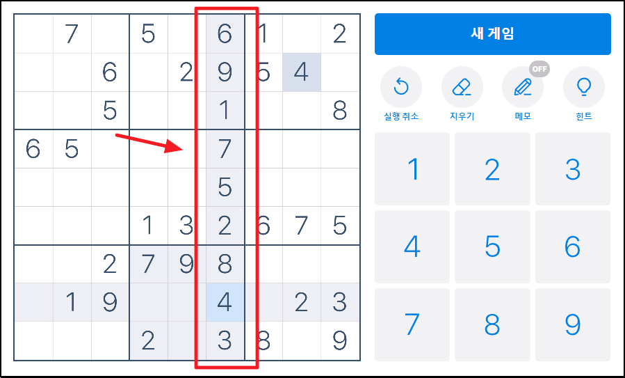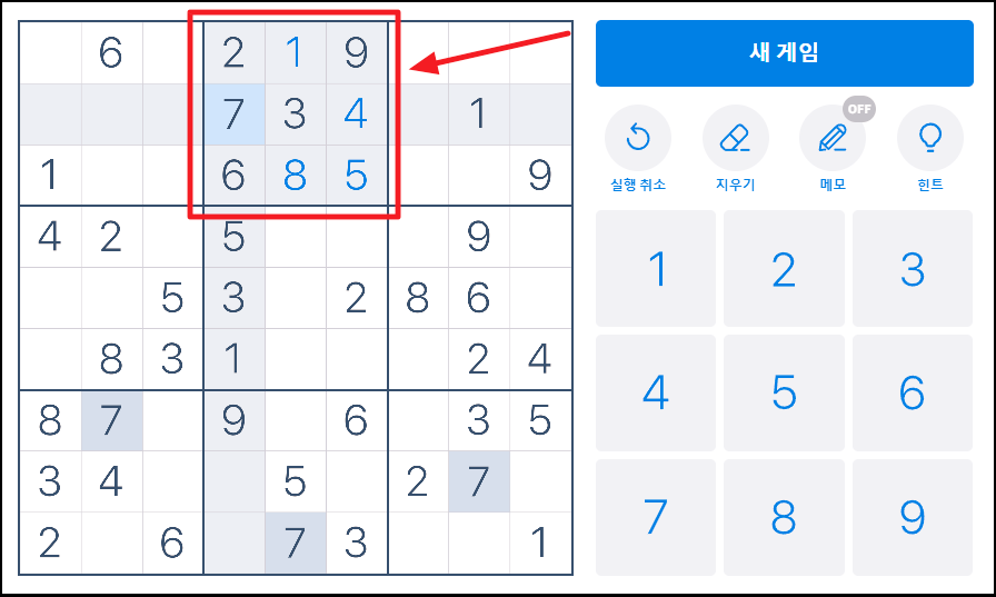 여기서 스도쿠 푸는요령을 추가하자면 처음부터 한 줄을 모두 입력하려고 하면 안됩니다. 그것보다는 힌트가 많은(주변에 입력된 숫자가 많은) 곳부터 숫자를 찾아내는 방식으로 스도쿠 게임을 진행하면 돼요.