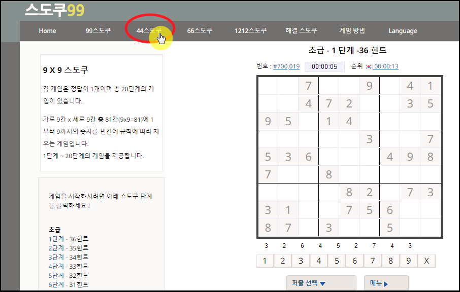 이것도 초급 단계이기 때문에 이를 통해 푸는 방법을 익히는 것도 좋습니다. 이래도 문제 푸는 방법이 이해가 되지 않는다면 메뉴에서 [44스도쿠]를 클릭해 보세요.