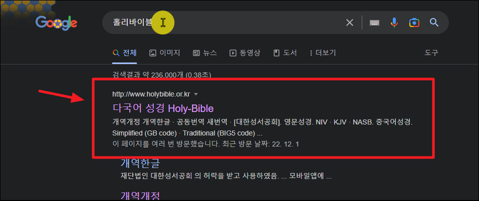 우리가 선택한 문장을 포함한 성경 내용이 나왔네요. 해당 페이지는 물론이고, 이전 페이지와 다음 페이지 그리고 전체 장도 읽어 볼 수 있어요.