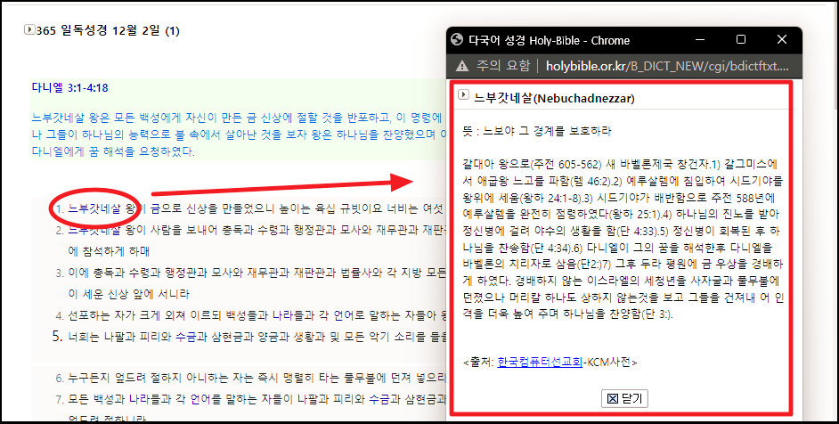 앞에서 언급한 바와 같이 한국컴퓨터선교회의 KCM 사전을 통한 사전 서비스도 이용할 수 있습니다. 이런 식으로 성경을 읽으면 이해하기도 좋고, 재미도 있어서 정말 좋아요.
