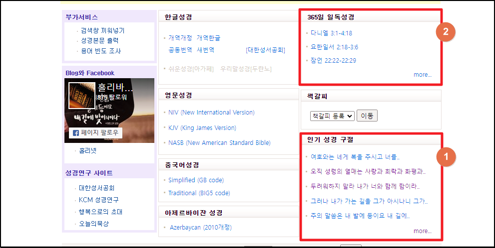 홀리바이블 사이트에 접속했어요. 이곳에서는 한글은 물론이고, 영문이나 중국어, 아제르바이잔어로 읽을 수 있는 성경 자료가 마련되어 있는데요.
