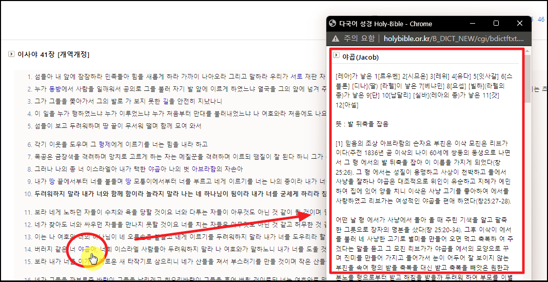 앞에서 언급한 바와 같이 한국컴퓨터선교회의 KCM 사전을 통한 사전 서비스도 이용할 수 있습니다. 이런 식으로 성경을 읽으면 이해하기도 좋고, 재미도 있어서 정말 좋아요.