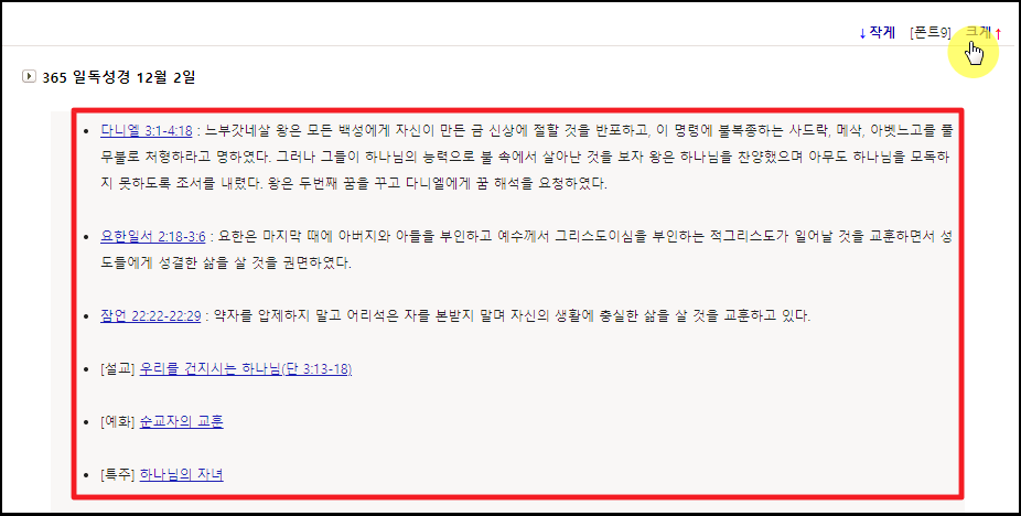 페이지 화면에서 우측 상단에 보면 폰트를 크게 하거나 작게 할 수 있어요. 여기에서 마음에 드는 구절을 클릭해 보세요.